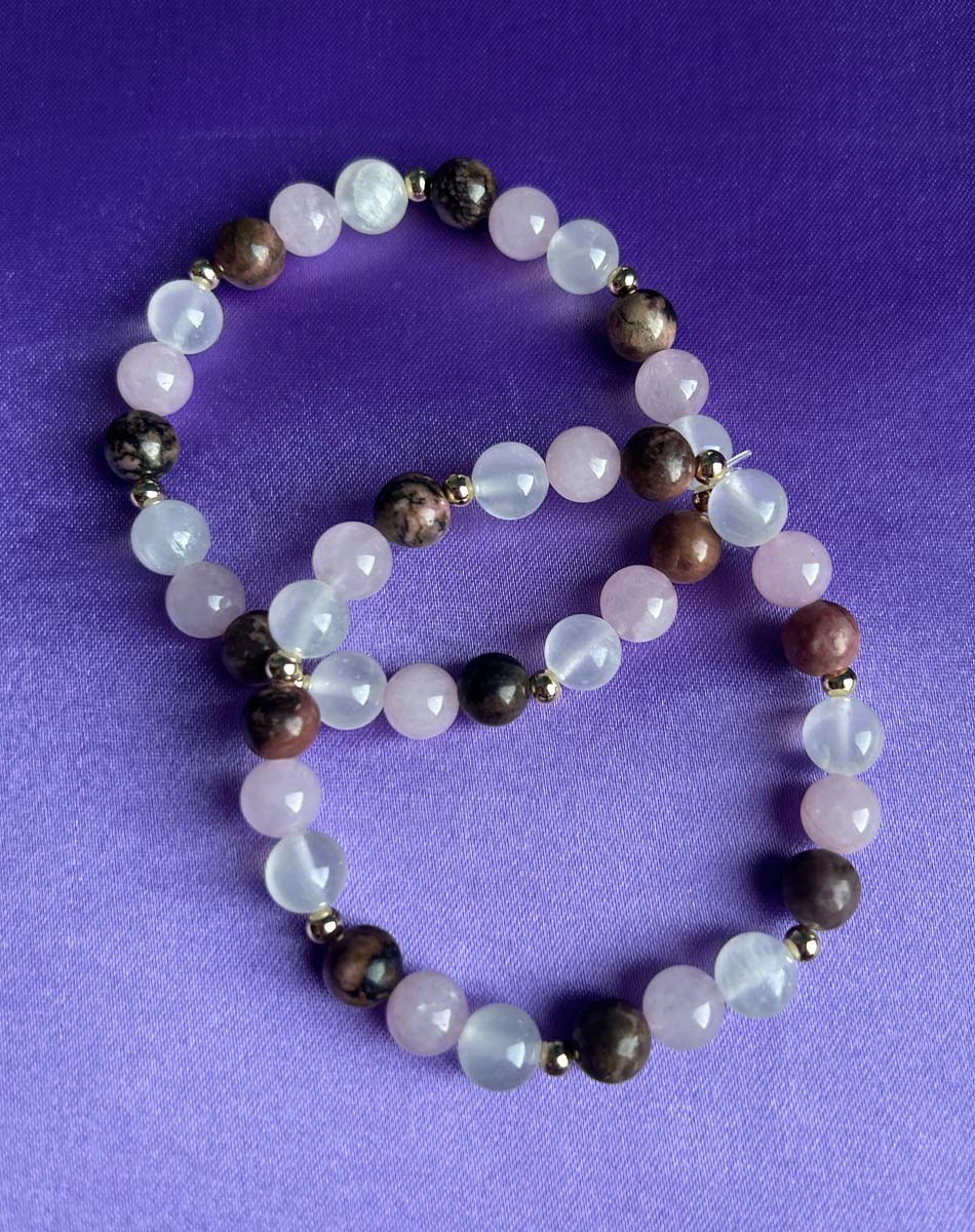Wrap yourself in the gentle, nurturing energies of Rose Quartz, Rhodonite, and Moonstone with this thoughtfully designed bracelet. Rose Quartz, the stone of universal love, helps open your heart to compassion and emotional healing. Rhodonite enhances forgiveness and self-love, providing balance during times of emotional stress. Moonstone, with its soft glow, deepens your intuition and promotes calm, reflective energy. Perfect for those seeking harmony and inner peace, this combination supports your journey of love and healing.